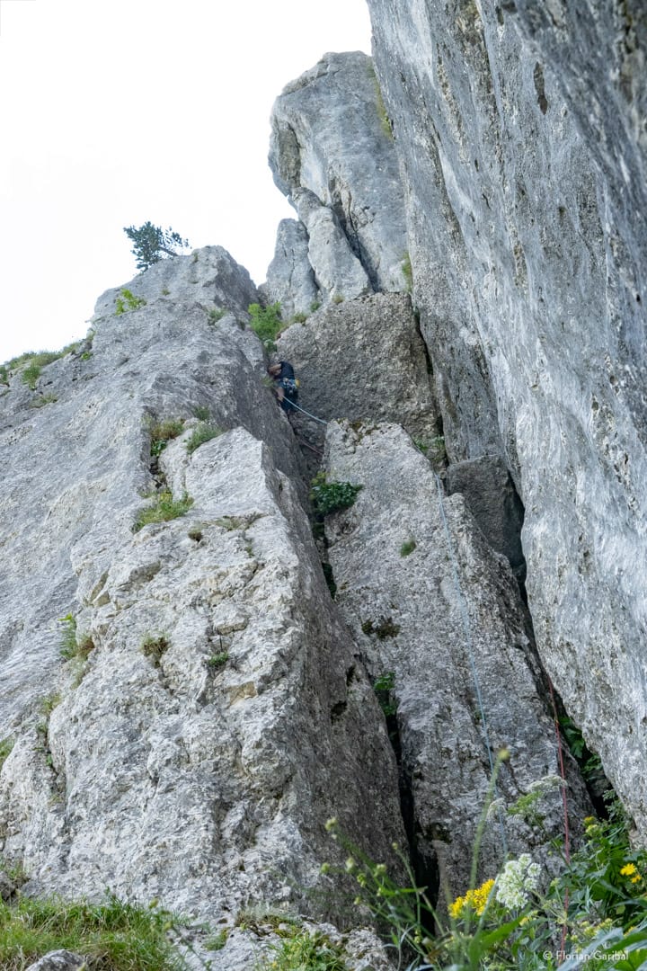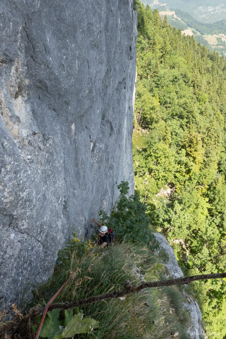 Tout au long de l'itinéraire, on observe de part et d'autre la raideur de la face où très peu de végétation pousse comparé à notre ligne. Nous sommes d'ailleurs pas peu contents d'être sur des relais confortables la majorité du temps !